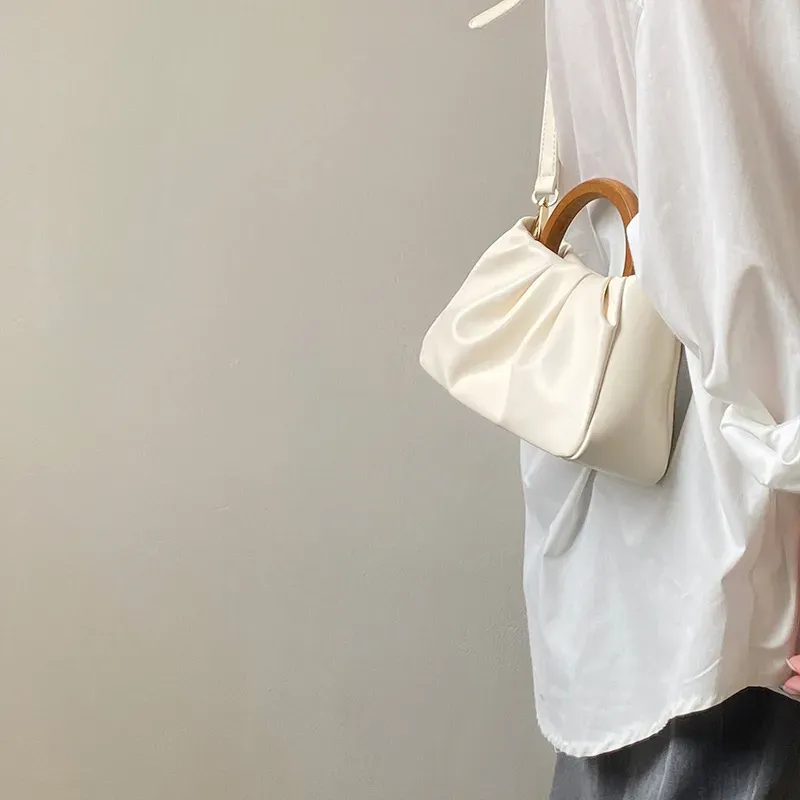 Wooden Handle Pleated Cloud Small Handbag Women One-Shoulder Mini Bag