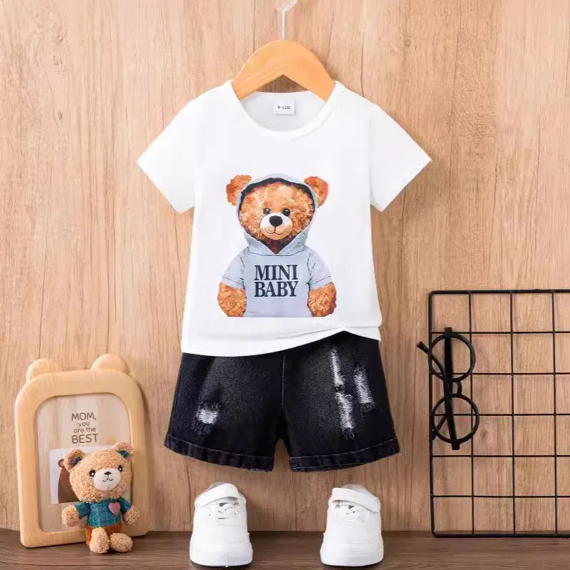 Wholesale Baby Boy Fashion Cute Cartoon Bear Print Short Sleeve T-Shirt Denim Shorts Two-Piece Set