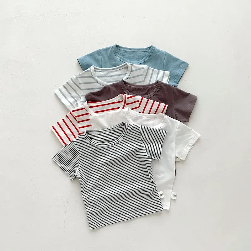 Wholesale Kids Baby Fashion Casual Solid Color Stripe Cotton Round Neck Short-Sleeve T-Shirt