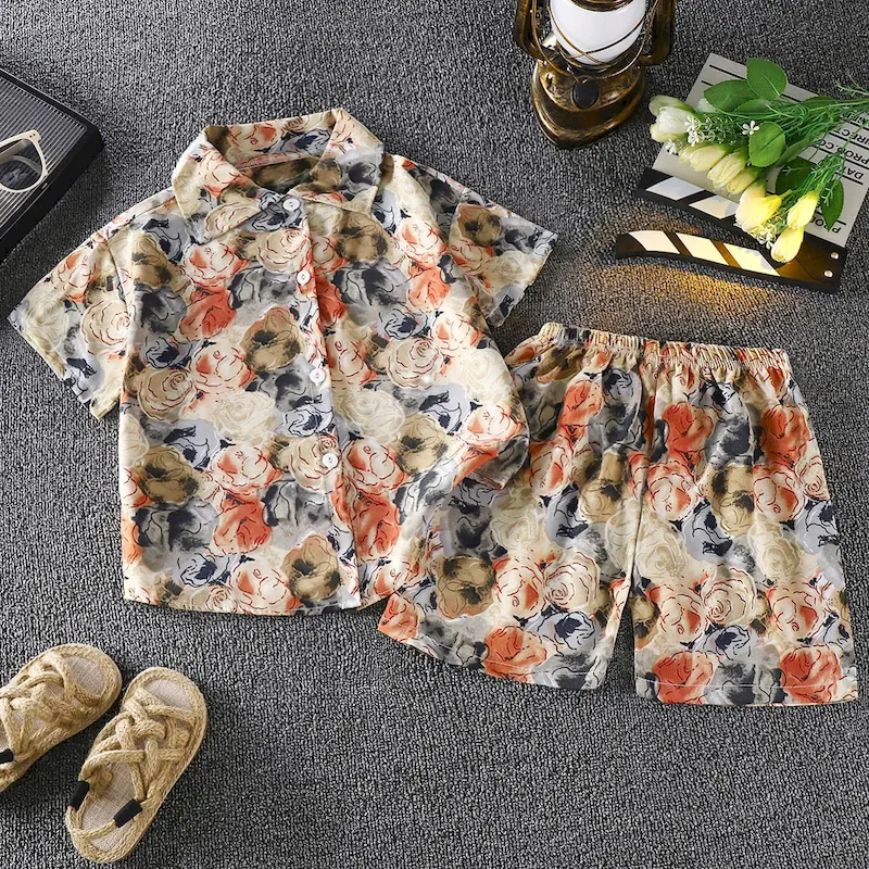 Wholesale Boy Fashion Casual Printed Lapel Short Sleeve Blouse Loose Shorts Two-Piece Set