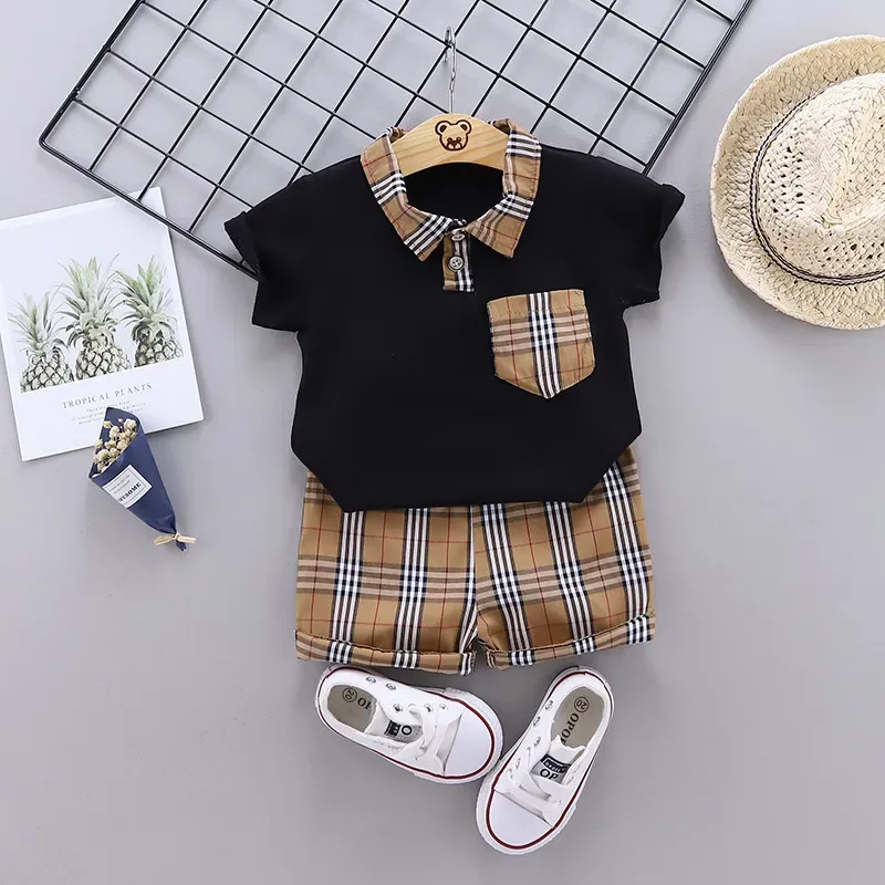 Wholesale Boys Fashion Casual Splicing Lapel Short-Sleeve T-Shirt Loose Shorts Two-Piece Set