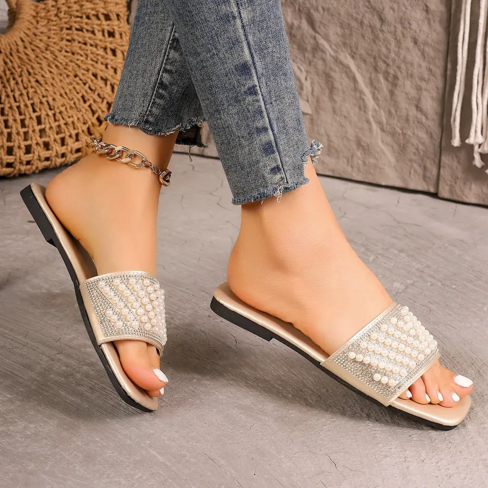 Women Fashion Casual Pearl Square Toe Flat Slippers
