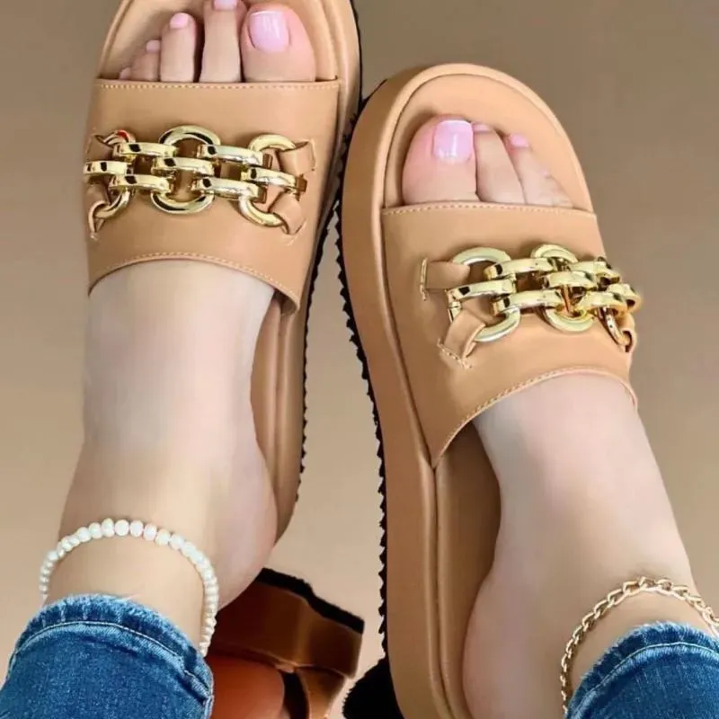 Women Fashion Round Toe Metal Chain Casual Thick Bottom Pu Slippers