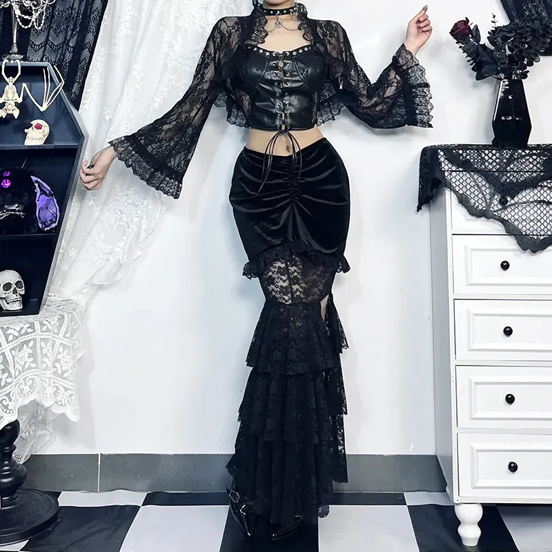 Women Fashion Dark Gothic Multi-Layer Stitching Split Fishtail Skirt