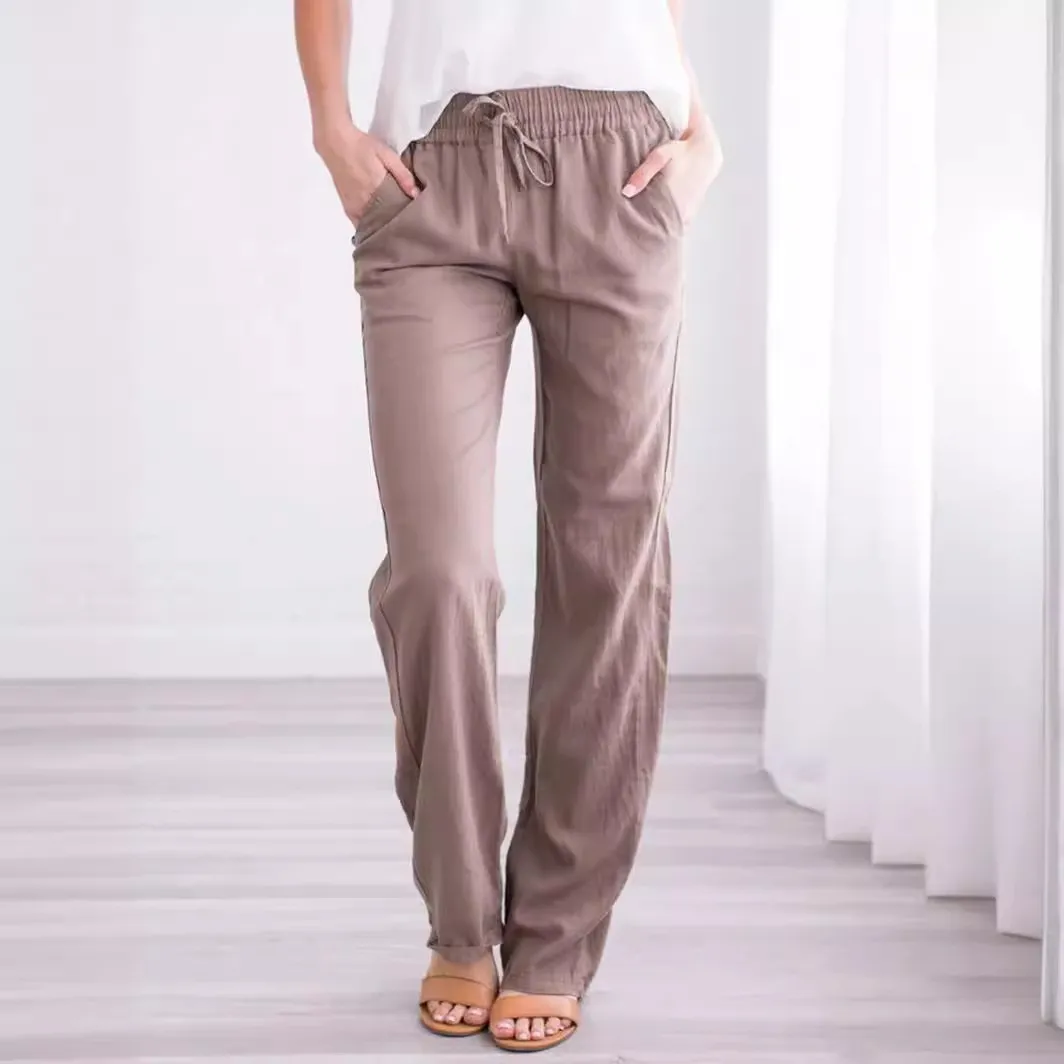 Women Casual Solid Color Cotton And Linen High Waist Pants