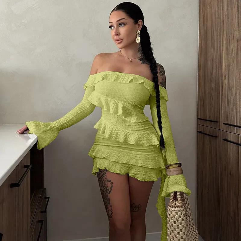 Women Sexy Solid Color Irregular Pleated Off Shoulder Slim Fit Dress