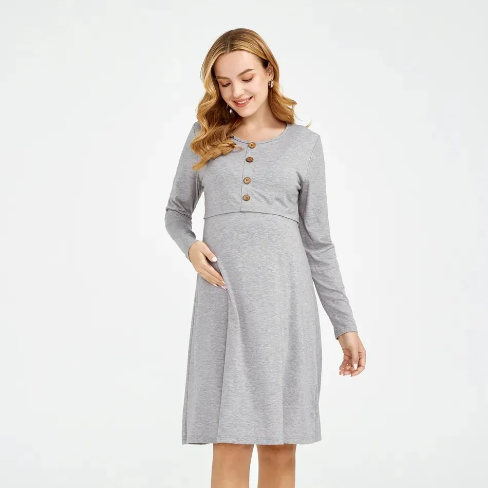 Pregnant Women Casual Solid Color Round Neck Long Sleeve Breastfeeding Dress