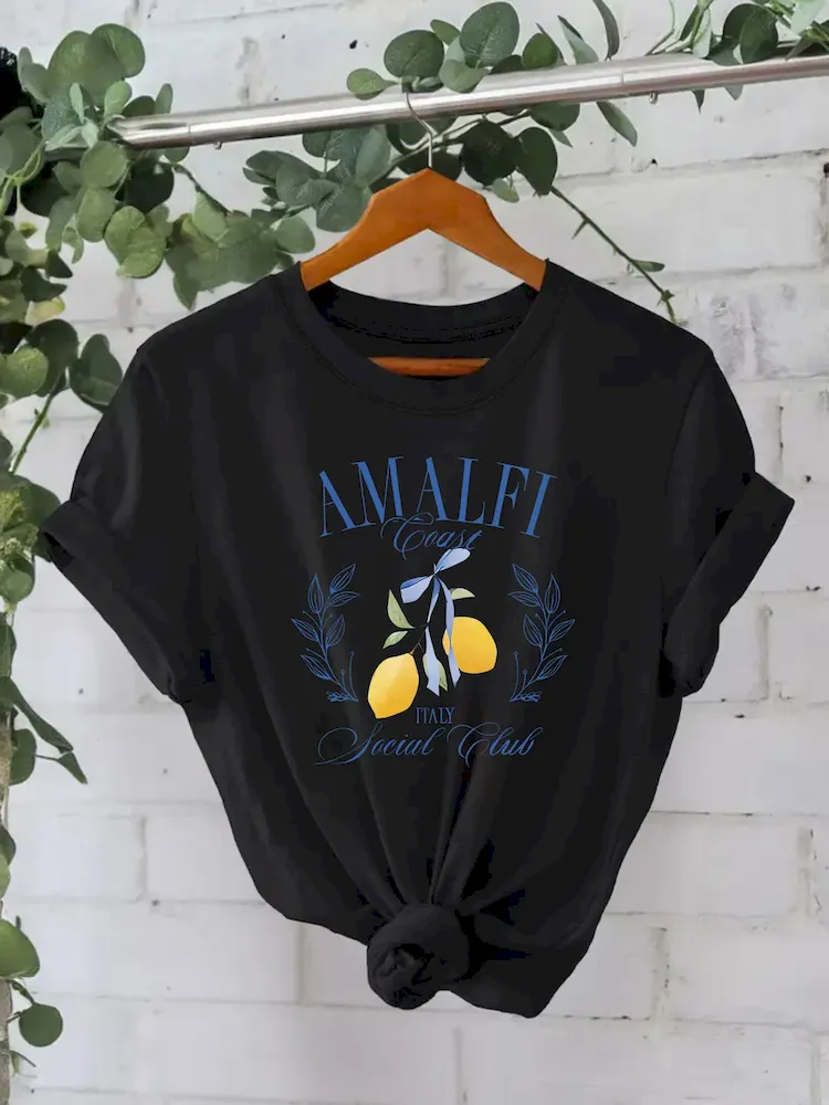 Women Pure Cotton Summer Short Sleeve Round Neck Lemon Pattern Printed T-Shirt