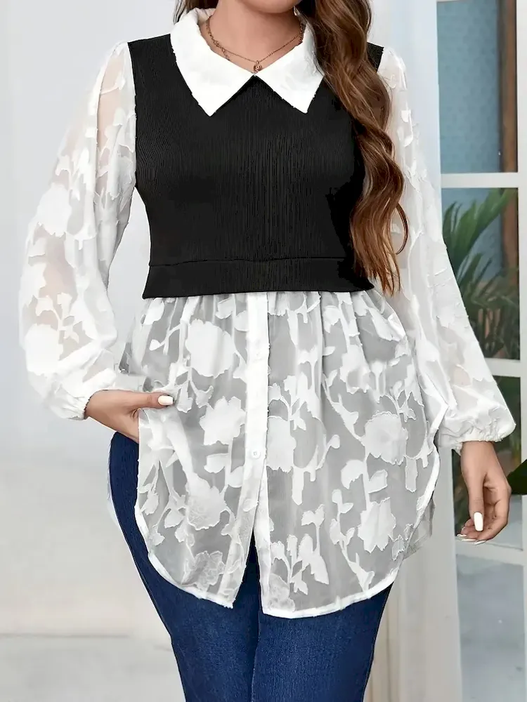 Women Fashion Casual Plus Size Splicing Contrast Color Lapel Lantern Sleeve Blouse