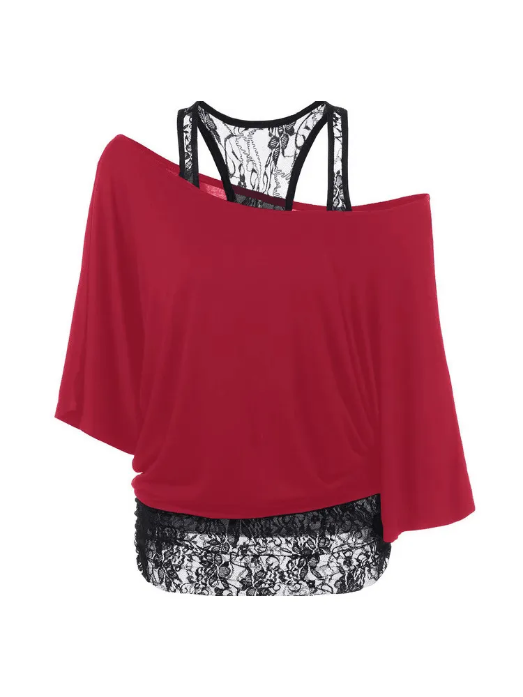 Women Fashion Plus Size Lace Splicing Slanted Shoulder Bat Sleeve T-Shirt