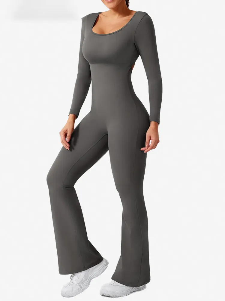 Women Fashion Casual Solid Color Square Neck Long-Sleeve Backless Yoga Sports Jumpsuits