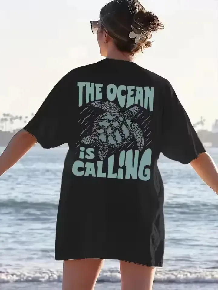 Women Fashion Casual Letter And Turtle Printed Round Neck Short-Sleeve T-Shirt