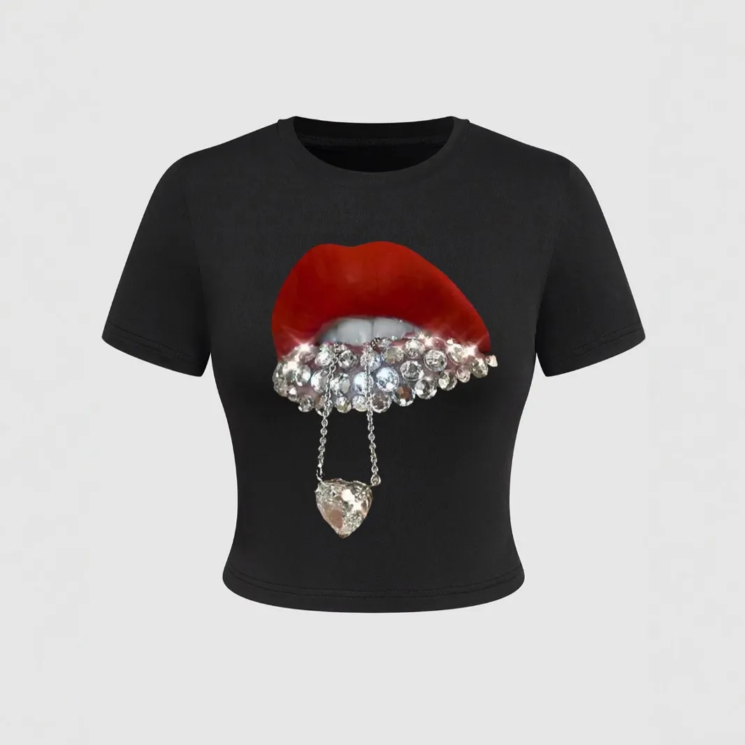 Women Fashion Sexy Magic Claw Rhinestone Printed Short-Sleeve T-Shirt