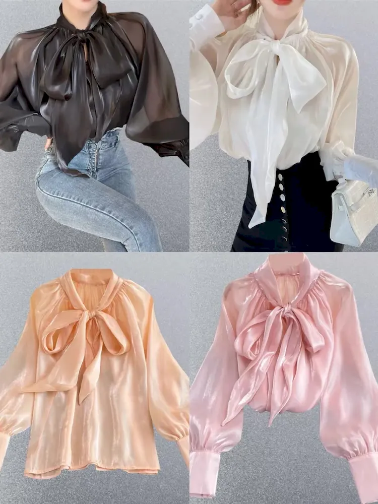 Women Fashion Bow Lace Long Sleeve Organza Shirt