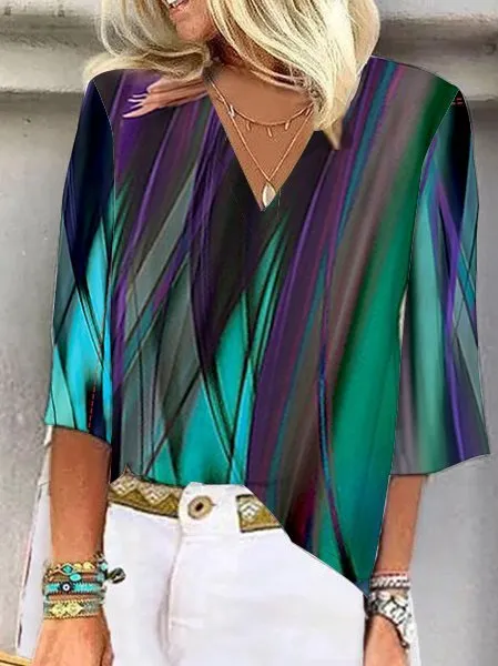 Women Fashion Colorful Geometric Floral Print V-Neck Shirt Top