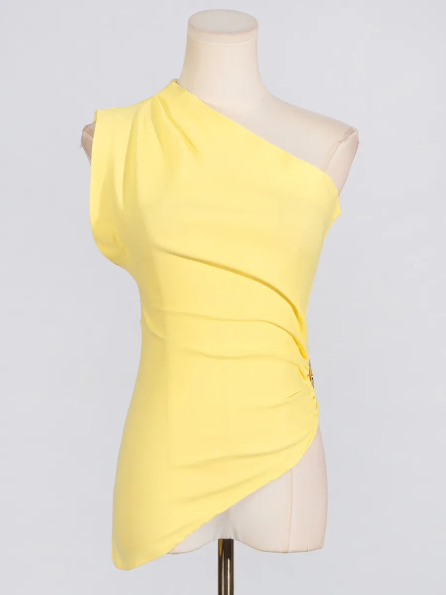 Women Fashion Sexy Solid Color Pleated Metal Buckle Slant Shoulder Sleeveless Tank Top