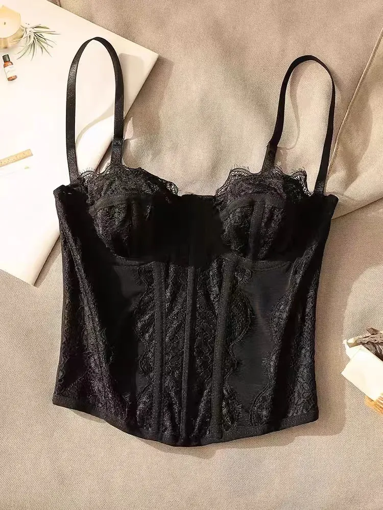 Women Fashion Sexy Solid Color Lace See-Through Corset Camisole