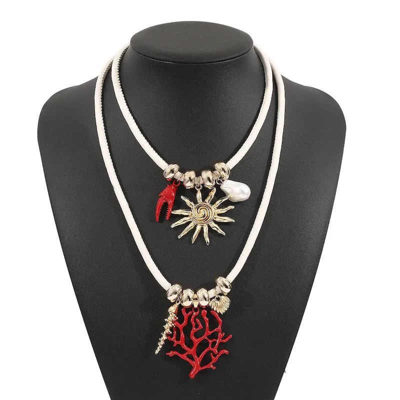 Wholesale Women Fashion Casual Beach Sun Coral Double Layer Leather Rope Necklace